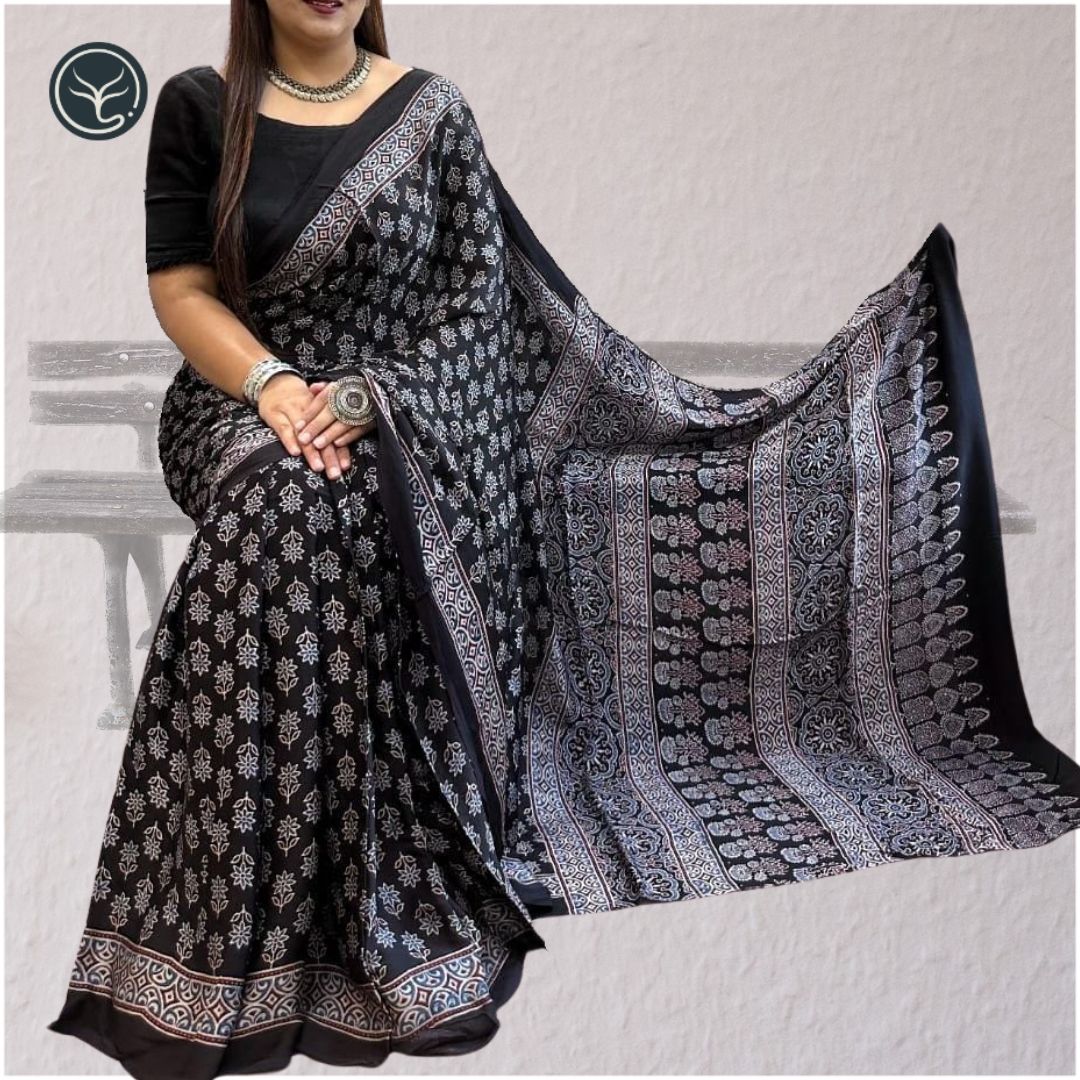 The Ajrakh block printed saree is a beautiful and unique piece of clothing that is steeped in tradition and culture. The intricate designs and patterns that adorn these sarees are created using a time-honored block printing technique that has been passed down from generation to generation. The blocks are hand-carved and then used to print the fabric, resulting in rich and vibrant colors that truly stand out.